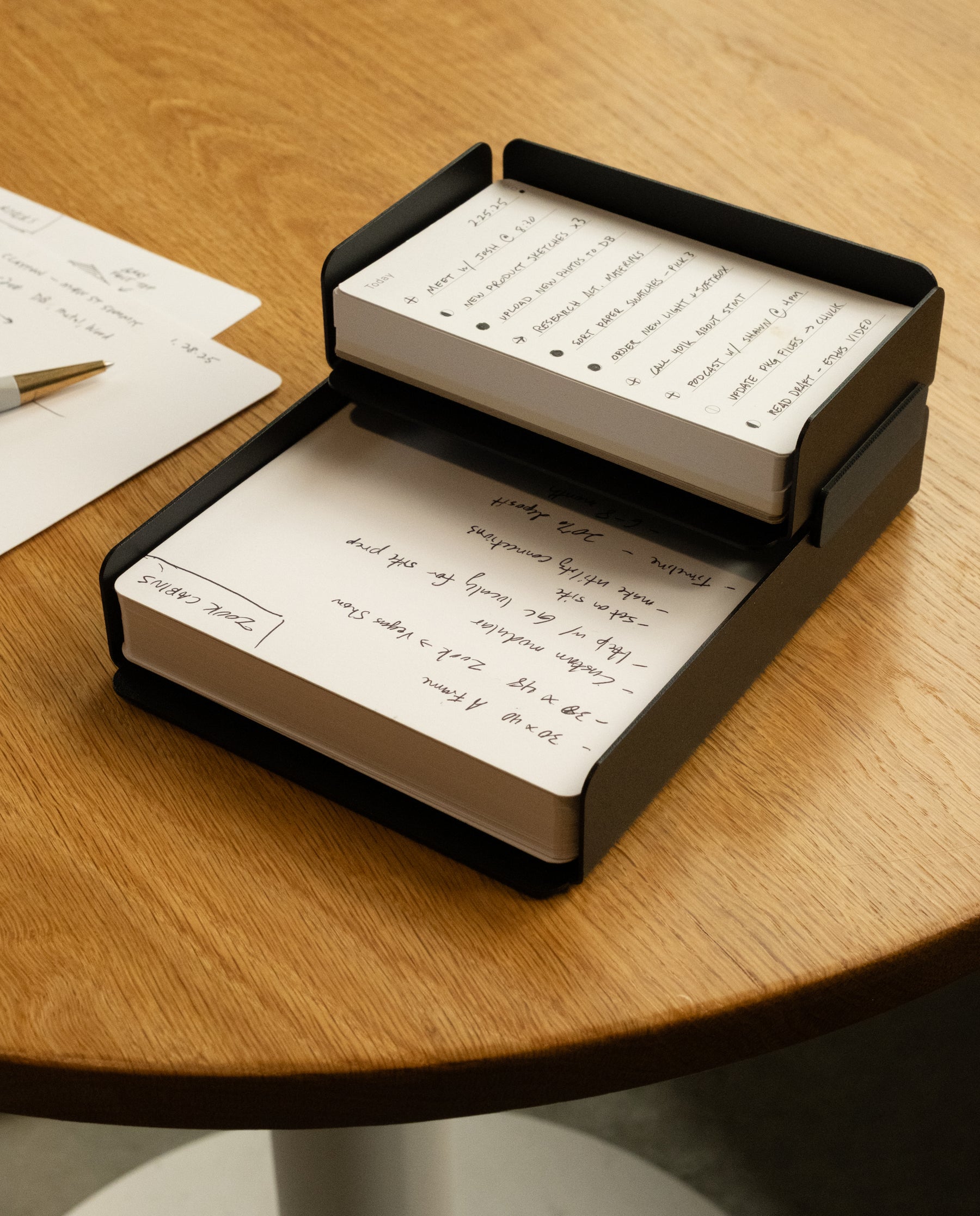 Capture Cards give you a dedicated place for jotting down ideas, notes, sketches, and everything in between. The stackable steel trays keeps blank cards ready, while a clever flap lets you slide completed ones underneath for easy storage.